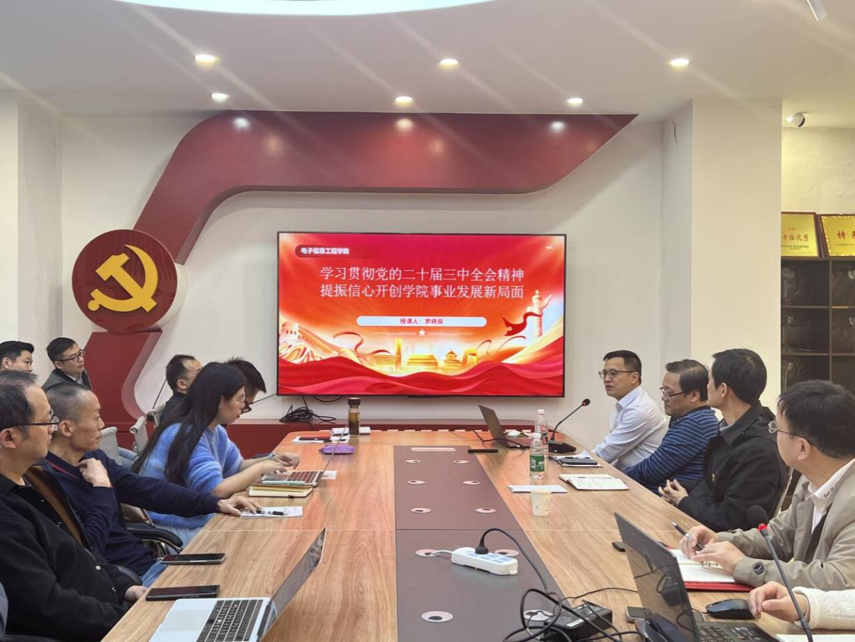 【供稿/电子信息工程学院】11月13日下午,学校党委委员、副校长罗晓良在电子信息工程学院以“学习宣传贯彻党的二十届三中全会精神,提振信心开创学院事业发展新局面”为主题宣讲党的二十届三中全会精神。电子信息工程学院全体教职工聆听党课。