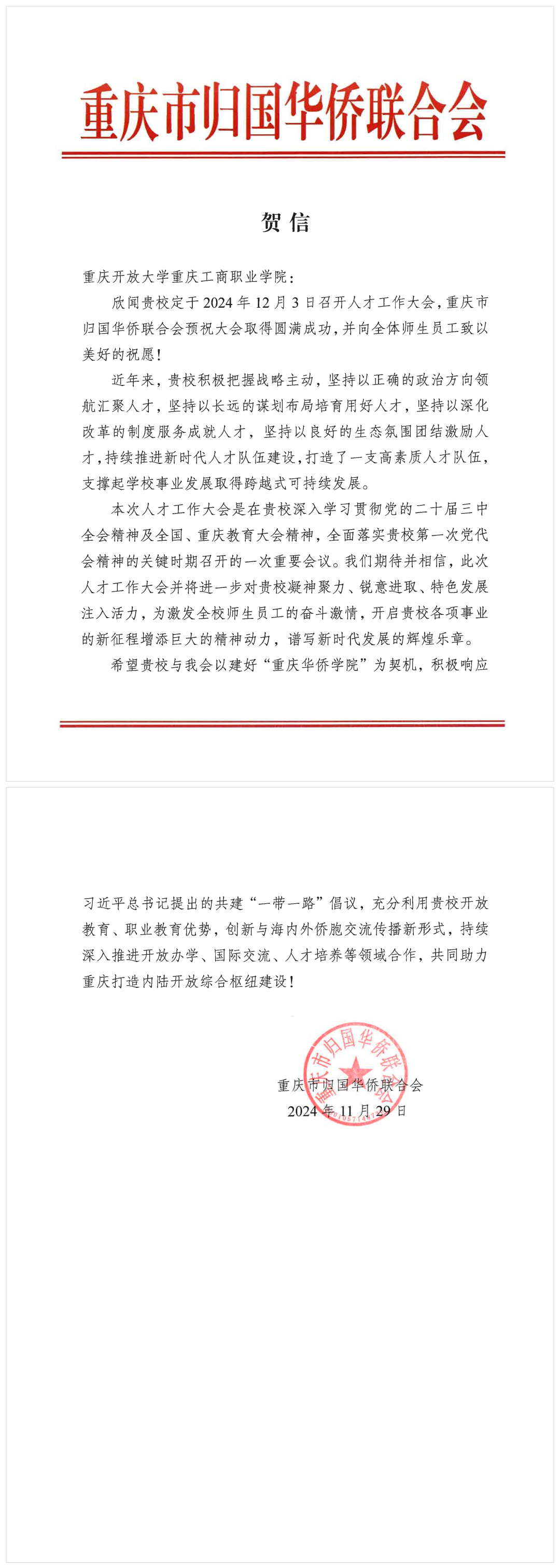 【组稿/党委宣传部】11月29日,我校人才工作大会筹备期间,重庆市归国华侨联合会发来贺信,预祝我校人才工作大会取得圆满成功。