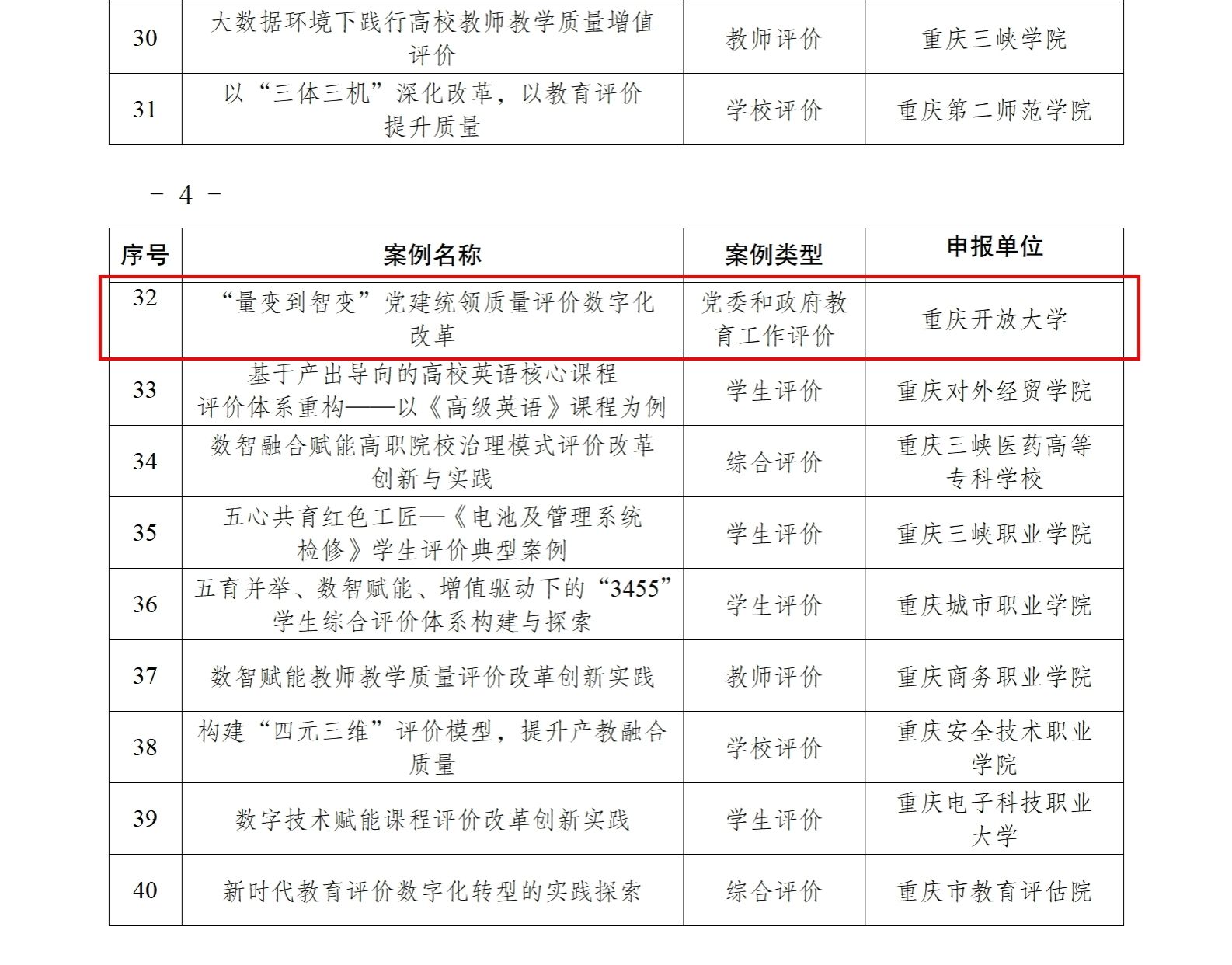 【供稿/发规处】近日,市教委公布了“重庆市第三批深化新时代教育评价改革典型案例”,我校由质量建设办公室牵头撰写的案例《“量变到智变”党建统领质量评价数字化改革》成功入选“党委和政府教育工作评价”类典型案例。