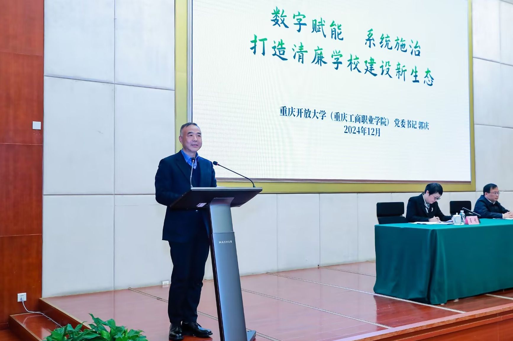 【供稿/纪检监察室】12月19日,重庆市清廉学校建设现场推进会在西南政法大学召开,我校应邀作现场交流发言。党委书记郭庆以《数字赋能系统施治打造清廉学校建设新生态》为题,介绍了我校对标市委“1669”清廉重庆建设总体架构,聚焦“六强五廉五风”,通过数字赋能、系统施治,实现顶层设计“一张图”、内部控制“一本账”、综合监督“一体化”、廉洁育人“一盘棋”,涵养风清气正的育人环境,打造清廉学校建设新生态所取得的阶段性成果。