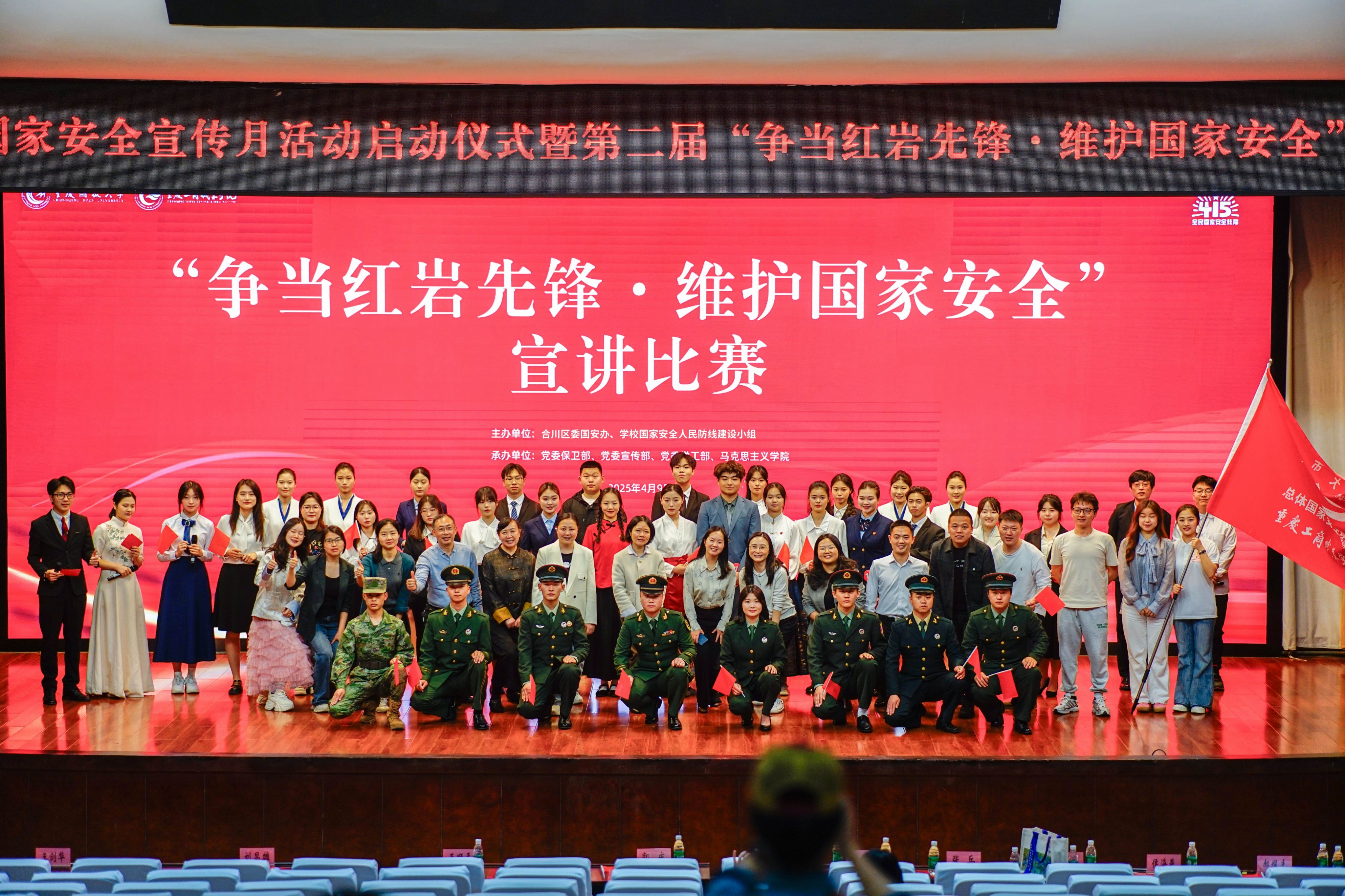 在第二届“争当红岩先锋·维护国家安全”宣讲比赛上,同学们通过主题宣讲、集体朗诵、歌舞等形式,“小切口”讲述“大安全”,从政治安全、经济安全、社会安全、文化安全、国土安全、军事安全、科技安全等入手,讲述自己身边的“国安小故事”,以铿锵有力的语言生动诠释发展是硬道理、安全也是硬道理,宣传总体国家安全观,普及国家安全法。