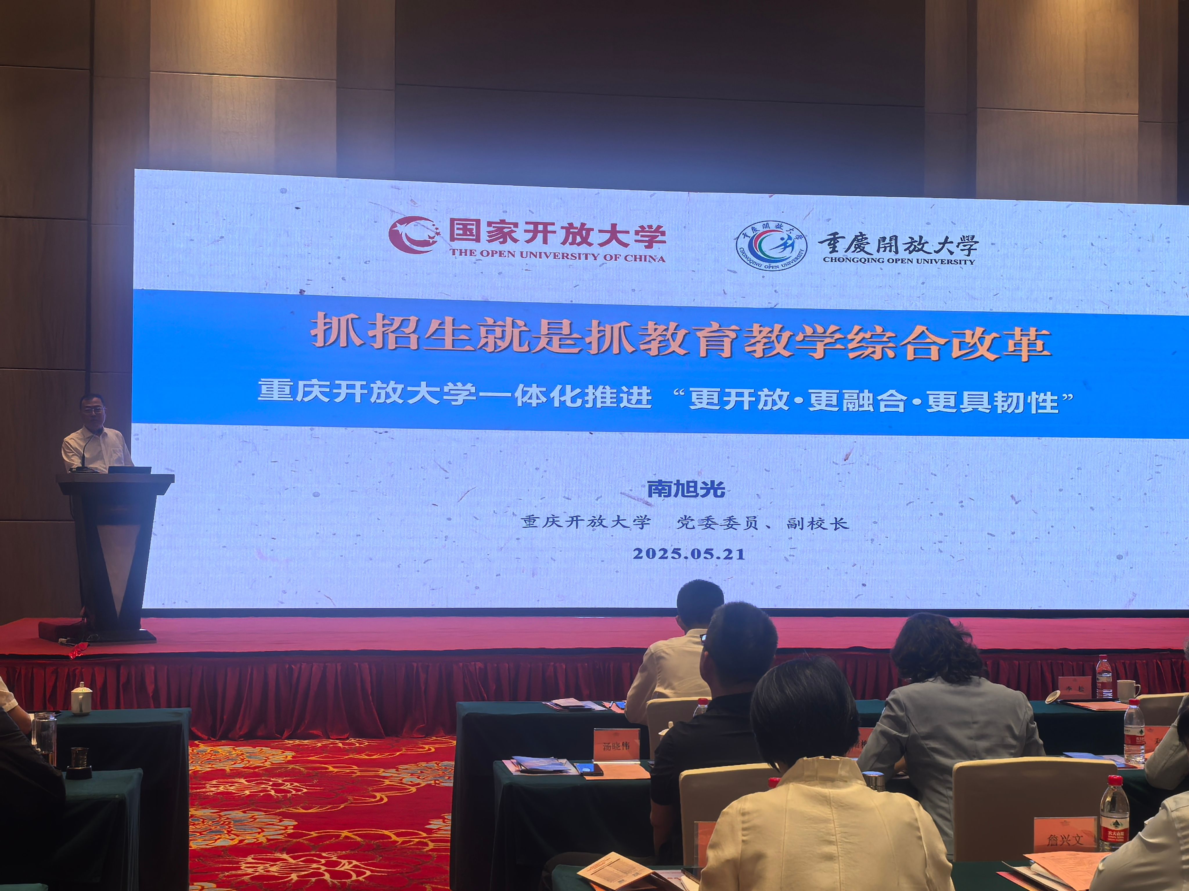 南旭光以“抓招生就是抓教育教学综合改革”为题,围绕重庆开放大学一体化协同推进“更开放·更融合·更具韧性”,从破壁拓界、协同创变、固本强基、闭环提质四个方面,介绍了重庆开放大学以引导性的策略重塑教育供给、以系统性的联结激活发展动能、以长效化的制度锻造办学韧性、以全周期的管理抓实招生规范的创新探索和实践。南旭光向与会人员分享了学校重构“效能驱动”的开放办学体系、打造“适需对路”的教育供给体系、设计“量质适配”的招生评价体系,通过建立工作责任约谈规定、优化基层单位绩效评价、深化教育教学综合改革,推动开放教育招生办学工作实现“三个转变”的实践经验,即从“单向输送”到“生态构建”、从“单线作战”到“多维发力”,从“学历补偿”到“能力补缺”。