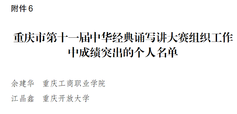 【供稿/创新教育学院】近日,重庆市教育委员会公布了全市第十一届中华经典诵写讲大赛获奖情况。我校师生获一等奖4项、二等奖5项、三等奖1项。2名教师获成绩突出个人称号。
