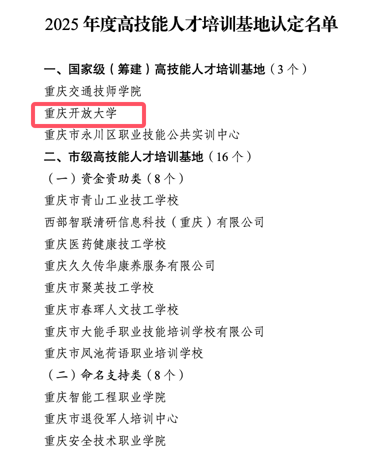 【供稿/远程教育处】近日,重庆市高技能人才工作联席会办公室发布《关于建立2025年度技能人才培训基地和技能大师工作室的通知》(渝高技办〔2025〕8号),重庆开放大学获批国家级高技能人才培训基地。