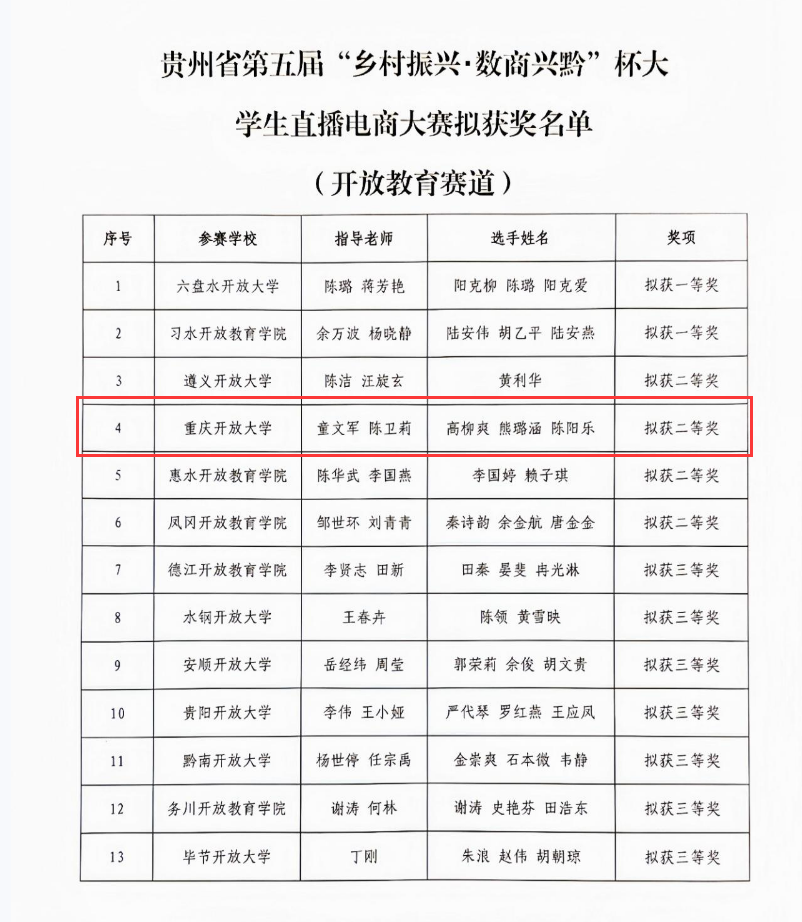 【供稿/远程教育处】近日,由贵州省教育厅和省农业农村厅联合主办的第五届“乡村振兴·数商兴黔”杯大学生直播电商大赛拟获奖名单揭晓,重庆开放大学参赛队伍凭借出色的直播策划与电商运营能力以及现场出色的实战能力,在西南三省一市62支高校队伍中脱颖而出。最终,参赛选手高柳爽、熊璐涵、陈阳乐(指导教师:童文军、陈卫莉)斩获开放教育赛道二等奖,实现了重庆开放大学在该项赛事上的新突破。
