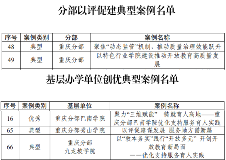 【供稿/远程教育处】近日,国家开放大学公布了分部办学评估典型案例名单,重庆开放大学及办学体系基层单位在评选中表现突出,共有5个案例入选。其中,重庆开放大学巴南学院申报的《聚力“三维赋能”铸就育人高地——优化支持服务育人实践,推动构建“三级联动”实践育人模式》荣获“基层办学单位创优典型案例”优秀等次,成为全国获评优秀的19个基层案例之一。