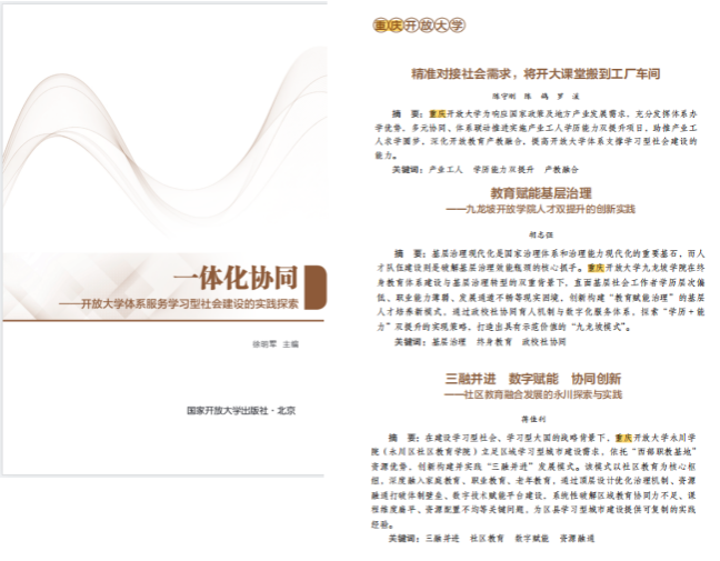 据悉,本次发布的案例集系统收录了全国开放大学体系服务国家战略、推动终身学习的128个实践案例。我校报送的《精准对接社会需求,将开大课堂搬到工厂车间》《教育赋能基层治理——九龙坡开放学院人才双提升的创新实践》《三融并进 数字赋能 协同创新——社区教育融合发展的永川探索与实践》等3个案例,从产业工人学历能力“双提升”、社区教育、教育赋能基层治理等方面,多维度集中展示了全市办学体系在服务全民终身学习方面的实践成果。