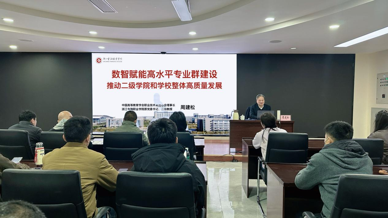 培训特邀中国高等教育学会职业技术教育分会理事长、浙江金融职业学院原党委书记周建松教授来校担任主讲。周建松从“人工智能背景下高水平专业群建设的基本逻辑”“以专业群为基础加强二级学院建设”“以高水平专业群建设推动学校高质量发展”“高质量发展与深化教学关键要素改革”等多个维度,深刻剖析了当前职业教育专业群建设的痛点、难点,对更新职教理念、厘清建设思路具有重要意义。