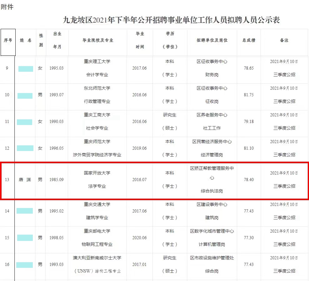 据悉,2021年下半年,九龙坡区公招中共有900多名考生参考,最终录取26名,唐渊同学是唯一来自国家开放大学的毕业生。目前唐渊同学已正式入职。他表示,将在新的工作岗位中继续发扬电大人不怕苦,不怕难,锐意进取,永攀高峰的精神,努力践行党的方针政策,服务好基层群众,争做新时代的楷模。