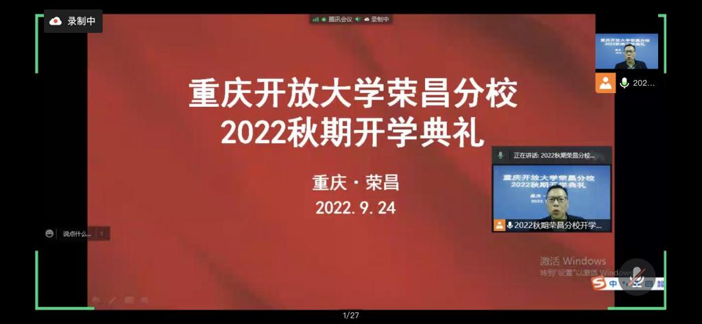 【供稿/荣昌分校】9月24日上午,荣昌分校通过腾讯会议线上举行了2022年秋季学期开学典礼暨新生开学第一课,进行了一次生动而又难忘的入学教育。荣昌分校校长余晓堰、电大及社区教育管理部相关教师、全体新生班主任、各专业负责人和404名新生参加了本次开学典礼。