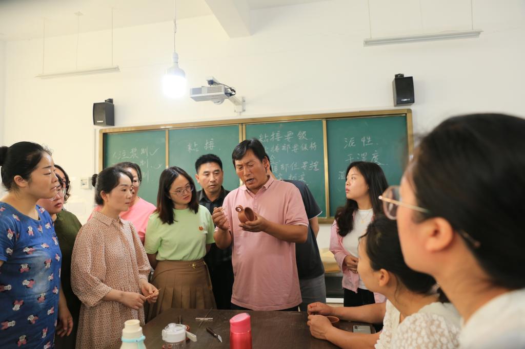 开班仪式上,荣昌分校电大及社区教育管理部朱泓燕副主任发表致辞,希望老师们通过学习紫陶的制作工艺,加深对建水陶的认识,提升陶艺制作技艺。培训中,学员参观了建水陶产教融合基地、紫陶博物馆,直观了解了建水紫陶六大工艺流程和建水千年紫陶文化发展脉络。在为期三天实操培训中,学员重点学习了建水陶独特的阴刻阳填工艺、无釉磨光工艺及陶艺作品打磨工艺。结业典礼上,陶艺授课教师一一点评学员作品,同学员交流荣昌陶和建水陶的不同特性和魅力,让学员直观感受中华陶文化的博大精深。