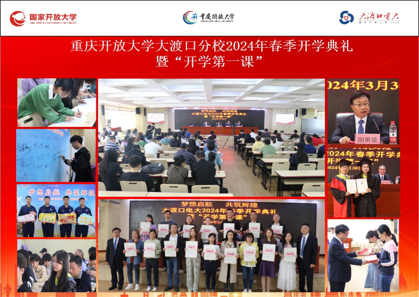 【供稿/远程教育处】2025年春期开学以来,重庆开放大学办学体系各基层单位以全面落实一体化推进教育教学综合改革要求为契机,相继举办开学典礼暨新生入学教育系列活动。各办学单位党政班子成员、教师代表及全体新生齐聚校园,共启教与学征程新篇章。党委委员、副校长南旭光受邀出席部分基层单位相关活动。