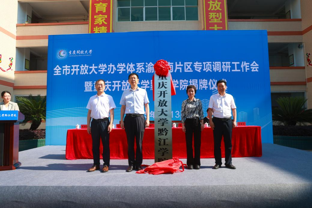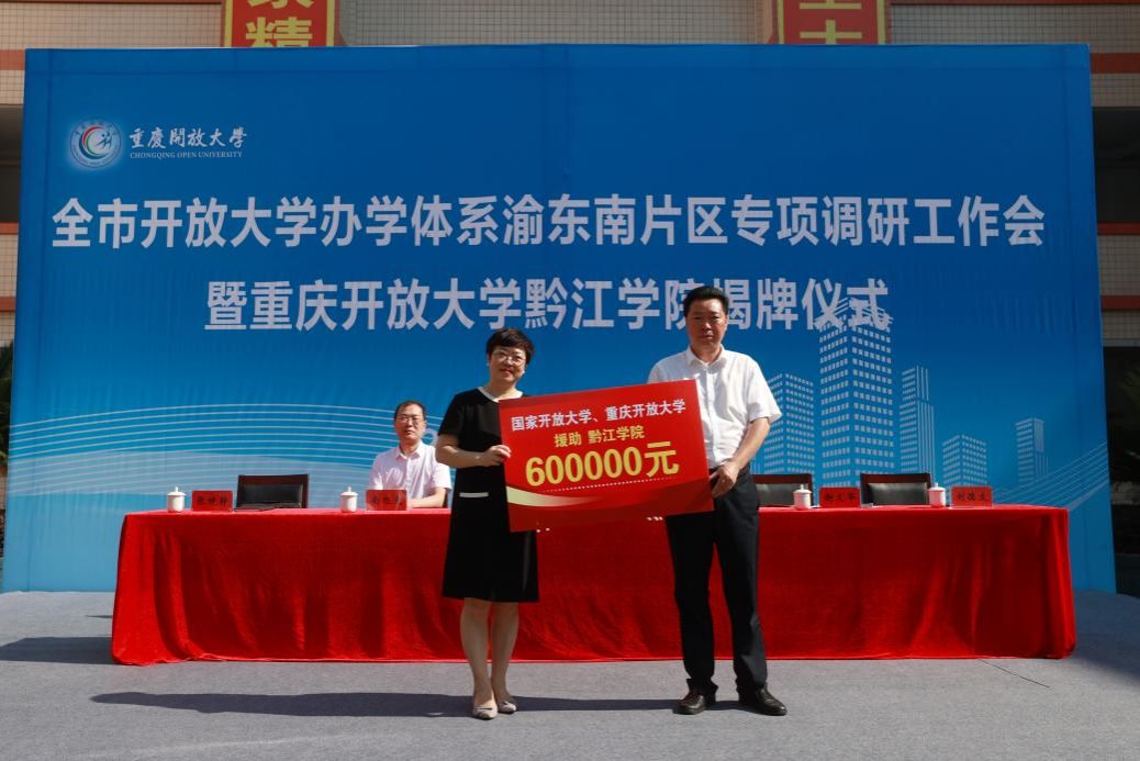 调研中,田盈、南旭光现场为黔江学院授牌。谢义华颁发开放大学发展援助项目资金。